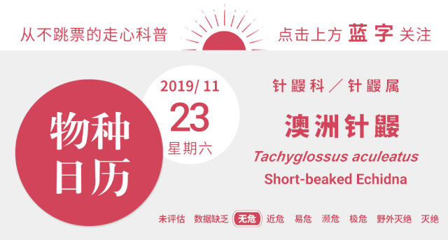 在IUCN红色名录中,澳洲针鼹被评为无危级(LC),目前种群状态比较好,没有明显的威胁。澳洲针鼹的适应力很强,但由于各种外来食肉动物的入侵,以及栖息地消失、车祸和疾病等原因,有些地区的澳洲针鼹已经灭绝了。虽然动物园中有圈养的澳洲针鼹个体,但它们繁殖的后代依旧很难存活。所以,我们还是要重视这种可爱的原始小动物,不要让它们受到太多威胁。