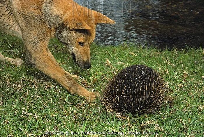短吻针鼹缩成一个球抵御澳洲野犬的攻击。图片:Jean-Paul Ferrero / Auscape / Minden Pictures