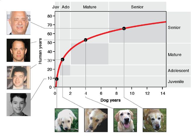 也许你已经开始心算乘7了。然而,这个广为流传的公式并不可靠。加州大学圣地亚哥分校的研究小组,根据“分子时钟”提出了一个新换算公式。这回你可以更准确地得出,家里那只汪星人到底相当于人类几岁了。此前的狗狗年龄换算人类年龄,一般是简单粗暴地乘7,原因是狗狗寿命常在10年左右,而人类寿命在70年左右。然而,这种换算法没有考虑到狗的发育和衰老进程与人类不同。美国狗狗协会(AKC)提过另一个估算公式——狗子1岁时相当于人类15岁,2岁时相当于人类24岁,此后每增加1岁就算成人类的5岁。这个算法考虑了狗狗在出生的头两年内会迅速成熟,比直接乘7要科学一些。狗狗岁数换算为人类岁数 =16× ln(狗的年龄)+31狗狗年龄(x轴)vs 人类年龄(y轴)。图片:Wang, T et. al. / biorxiv.org这个公式只适用于1岁以上的狗狗,不能用于不到1岁的狗狗。在一岁之内,可以用别的发育里程碑来对照,比如7星期(0.13岁)大的小狗狗,差不多等于9个月大的人类宝宝,这正好是两者都开始长牙的阶段。总之,从计算结果来看,狗狗是先迅速成熟,然后再慢慢衰老的。