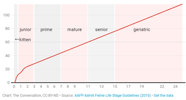 猫咪年龄(x轴)vs 人类年龄(y轴)。图片:The Conversation当然,和人类一样,宠物的营养和健康状况也会影响它们的内在“年龄”。总而言之,如果你有一个陪伴在侧的汪星人或喵星人,不妨算一算它的年龄,关注一下它在这个年龄段需要注意的健康问题。也许它还是个孩子,也许它已经步入花甲。时光会带走一切,但此时此刻,我们会留下相依相伴的温暖回忆。(编辑:八云)本文来自果壳,欢迎转发