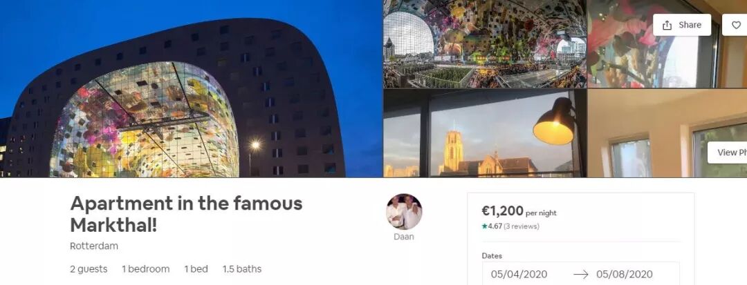 不差钱的也可以感受一下住在markthal楼上是什么体验,airbnb上1200欧一晚的价格成功劝退了我这只社畜,而且房东要求至少住4晚,土豪们如果成功入住,请留言分享入住体验哦!