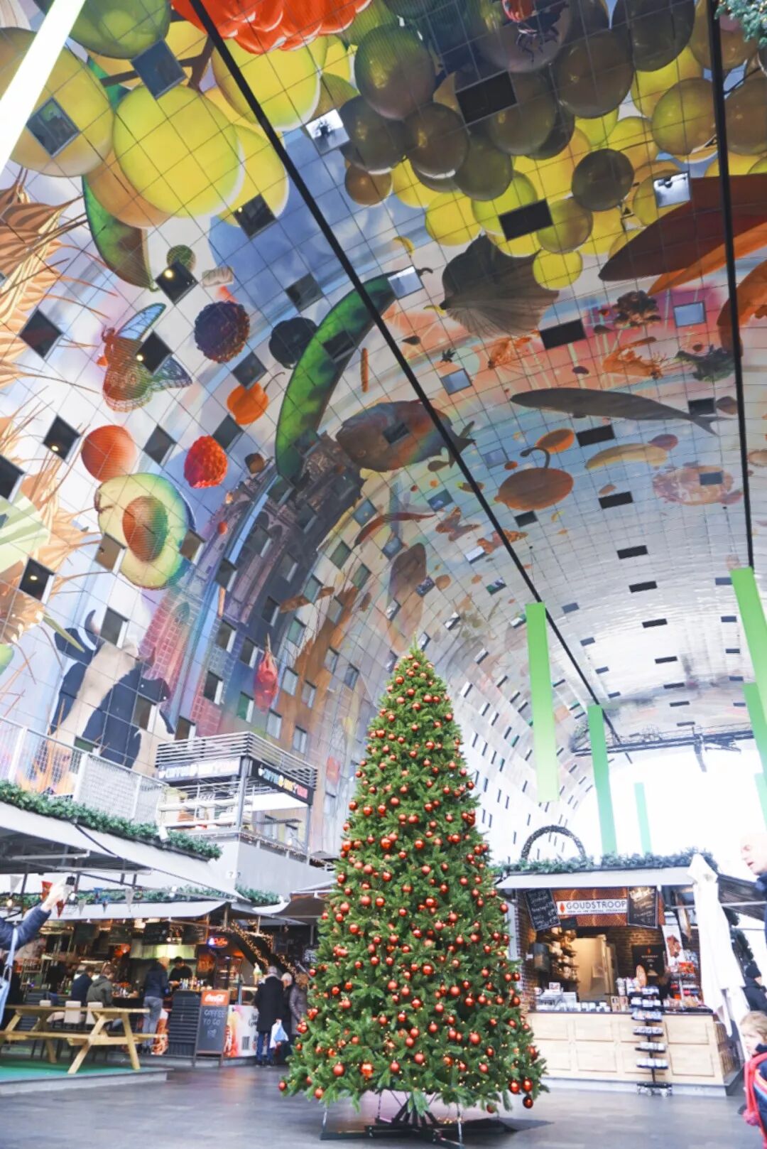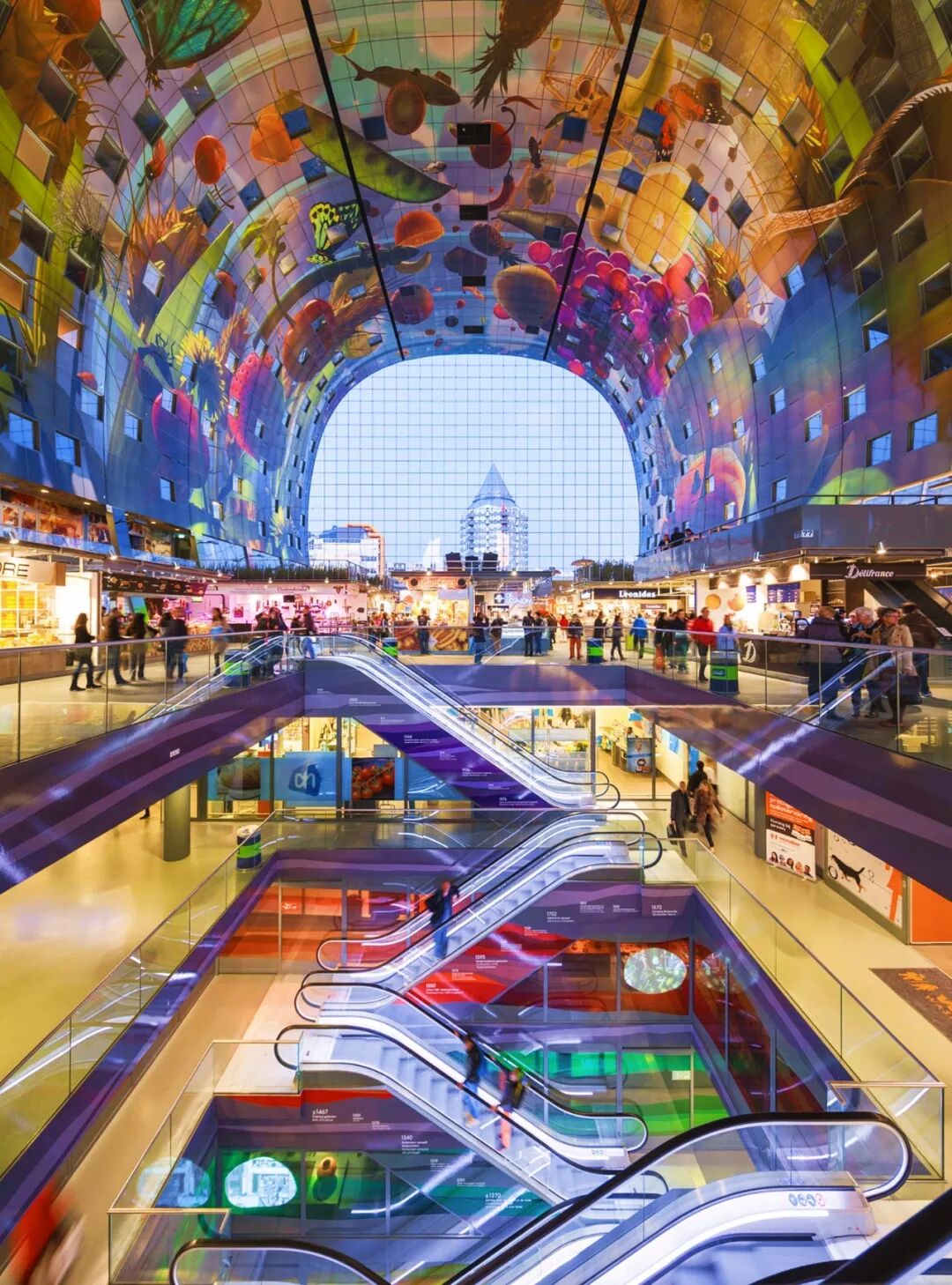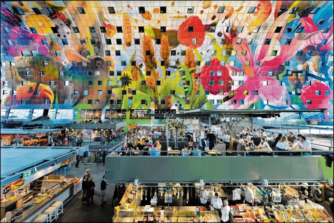 菜市场一进门就能看到非常酷炫的穹顶,穹顶彩绘名为“Horn of Plenty 丰足的号角”,总面积超过一万平米,是现今荷兰最大的艺术品,画面中的蔬果、面包、花卉则是在向荷兰黄金时代的静物油画致敬。