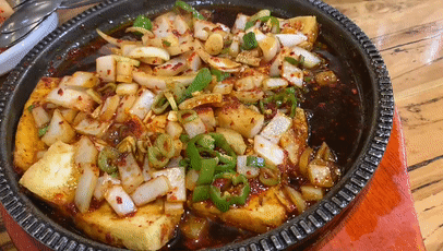旅程中最让人印象深刻的就是那些偶得的小惊喜。在洗浴中心里发现的这款铁板豆腐(是的,东北的澡堂子也卧虎藏龙!),看名字本以为只是一道大众菜,但味道却格外出挑。放在铁板上继续加热的豆腐,吸饱了汤汁香气扑鼻,和洋葱一起送入口,大家吃完一份立马要了第二份。