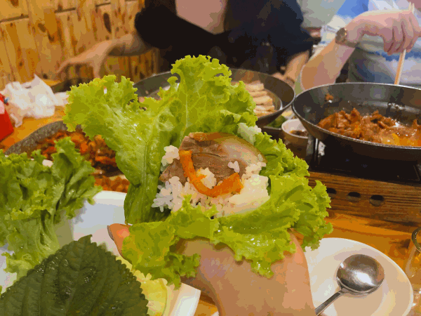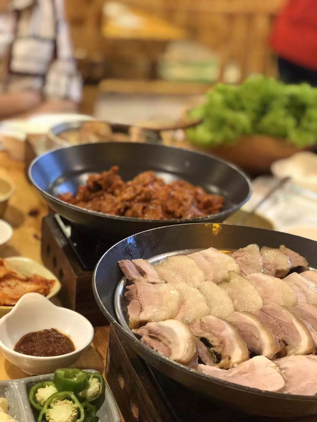 特制香料炖煮后的带皮猪肉没有一丝肉腥味,肥瘦相间、香滑弹润,口感软糯不腻。和微辣的小菜、包饭酱、米饭,还有脆嫩的生菜,一口下肚,口舌生香。