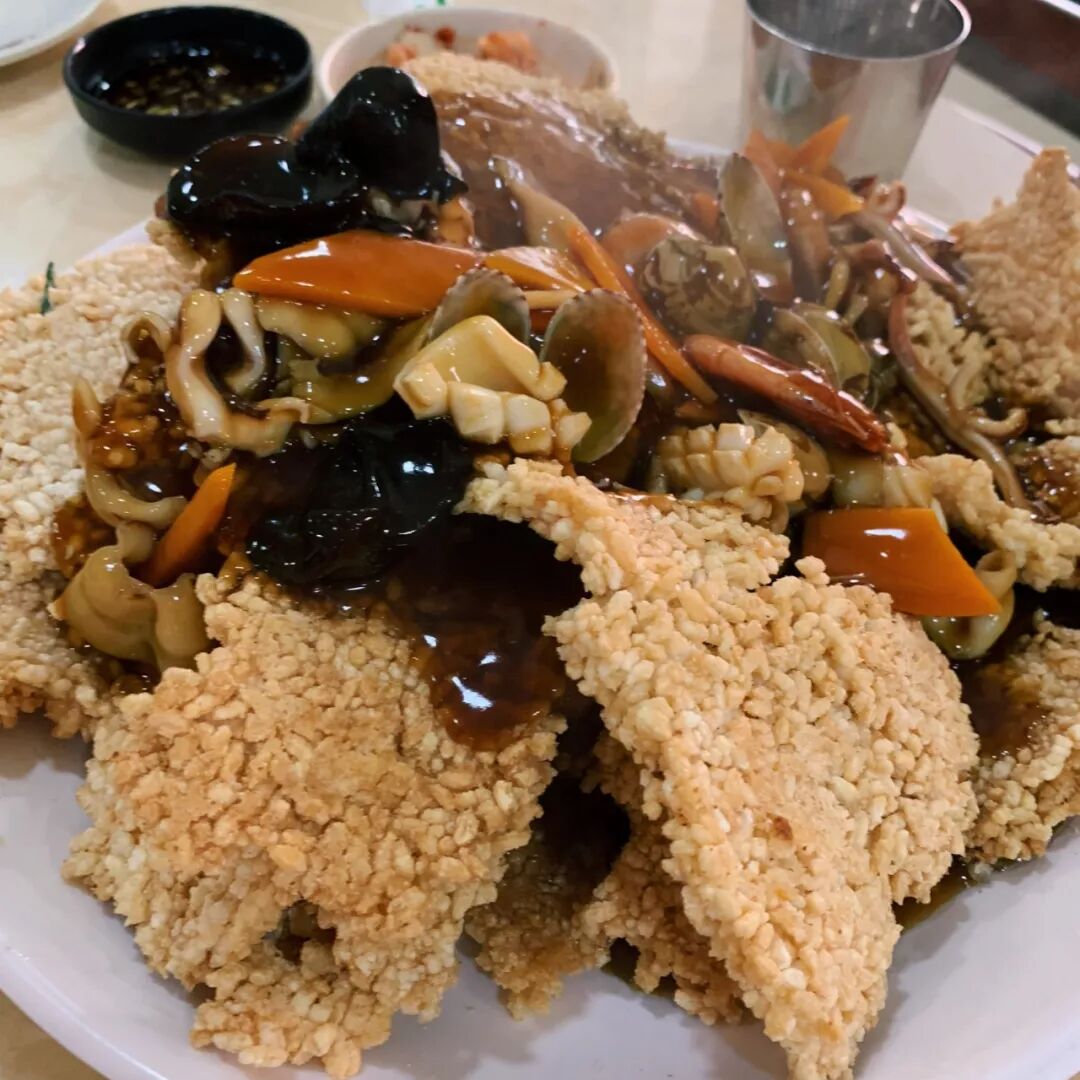 海鲜锅巴让我至今依然念念不忘,热腾腾的海鲜大杂烩浇在香脆的锅巴上,几分钟后,经过浸泡的锅巴变得绵软可口,米香混合在热汤汁中格外勾人。