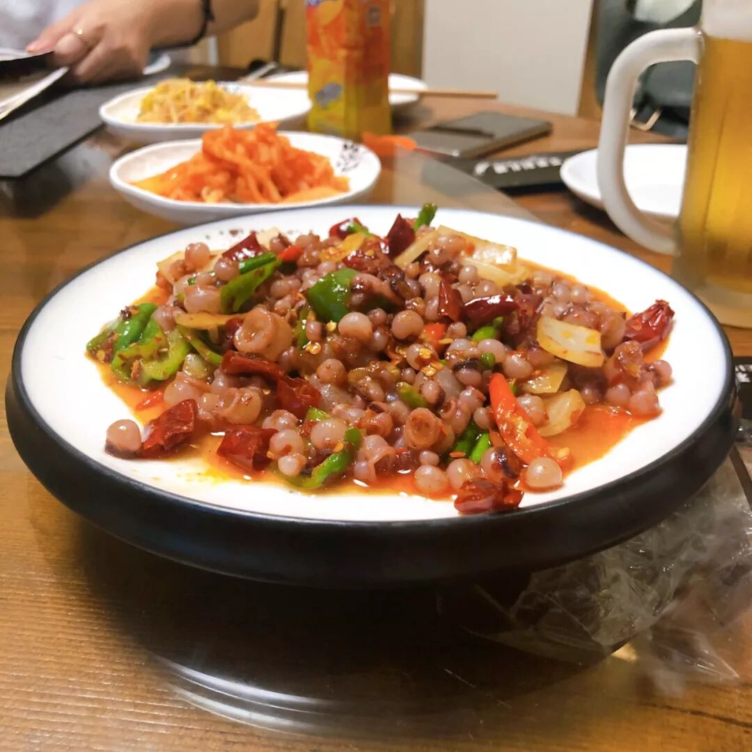这次还在一家啤酒屋吃到了很特别的凉拌海灵菇,给我留下了非常深的印象。海灵菇是章鱼脚上的吸盘,个头跟干黄豆差不多大,口感非常美妙,外面是一层劲道的皮,里面的肉比章鱼肉更糯一点,外脆里绵,和辣椒油碰撞出别样的风味。