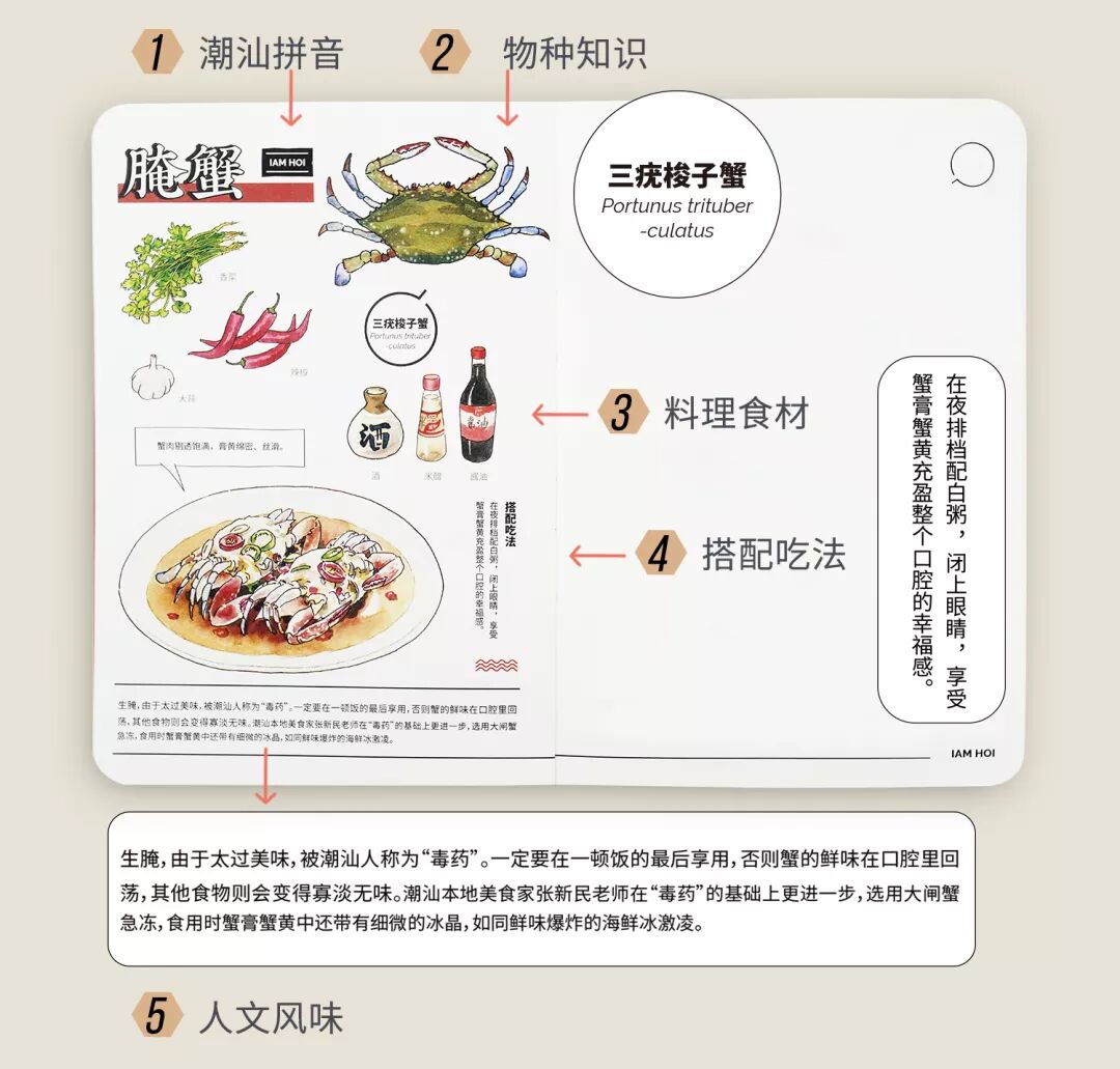 更让人惊喜的是,每一页菜肴,都包含潮汕拼音、物种知识、料理食材、搭配吃法和人文风味5个部分。深入浅出的介绍了这道菜的风味故事。
