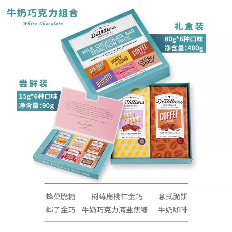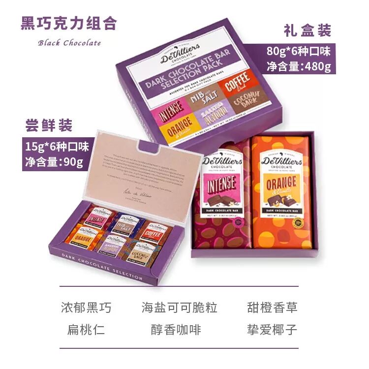 我们特意定制了不同规格不同口味搭配的礼盒:90g尝鲜装和480g礼盒装,黑巧克力组合和牛奶巧克力组合,每盒内都包含了6种不同口味。黑巧克力组合内含:浓郁黑巧、海盐可可脆粒、甜橙香草、扁桃仁、醇香咖啡、挚爱椰子,这6款口味我们试过了都很喜欢,没有高下之分,只有口味偏好的区别。