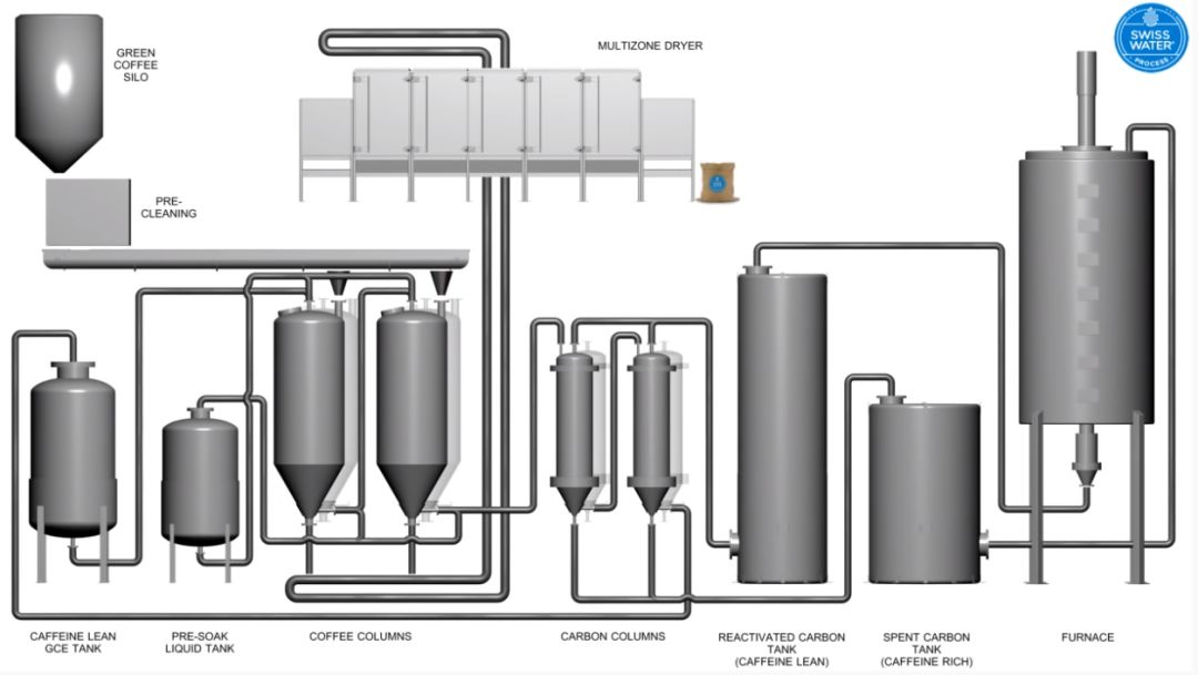 第一步:先把一批生豆泡水,能溶于水的化学物质都溶了,再把这批豆子捞起扔掉,然后用活性炭滤掉咖啡豆洗澡水里的咖啡因,其他风味还在水里,我们就得到了咖啡风味的饱和溶液。第二步:把下一批生豆倒进这溶液,此时第二批生豆的咖啡因会溶解在水里面,而其他风味不会,因为洗澡水是它们的饱和溶液,这样就做到了只去除这批咖啡豆中的咖啡因,完全没有动到其他的风味化学物质。这个方法的咖啡因去除率可以达到99.9%,也是咖啡因去除率最高的方法,完全不需要额外使用化学溶剂,有机咖啡、精品咖啡很多都在使用这种方法来去除咖啡因。这个方法使起来挺贵的,所以凡是使用瑞士水处理法的咖啡豆,大部分都会把处理法标(炫)记(耀)在包装上。
