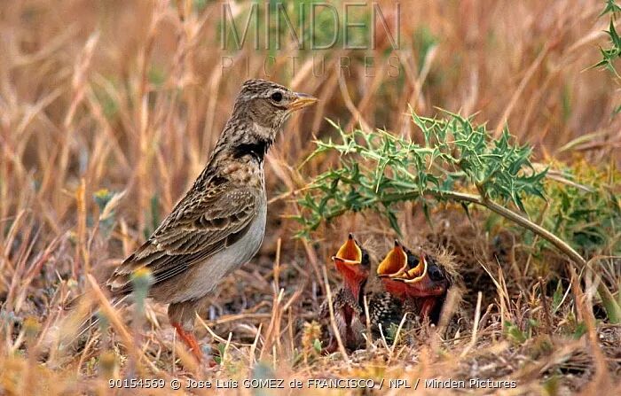 草原百灵成鸟和嗷嗷待哺的雏鸟。图片:Jose Luis GOMEZ de FRANCISCO / NPL / mindenpictures