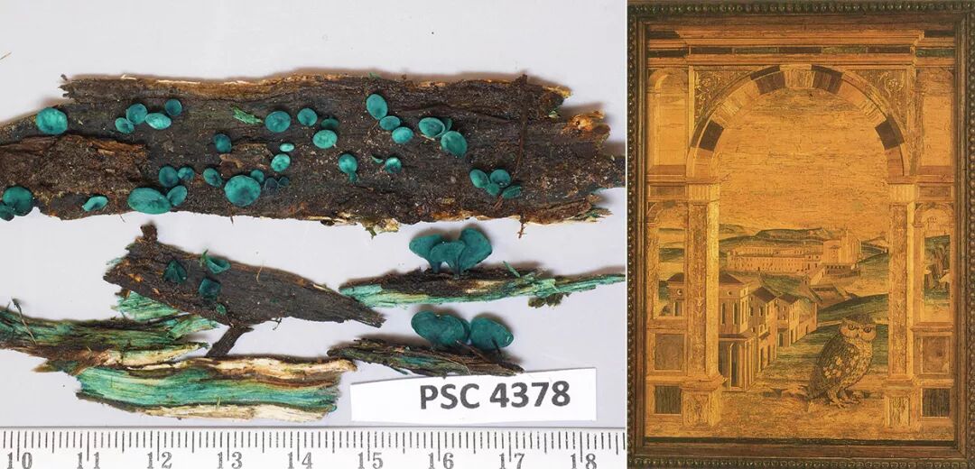 文艺复兴时期的艺术工匠自有方法。在挑选不同颜色的木材时,他们直接采集大自然帮忙染色的木头,来完成“调色盘”的配制——木材在被某些真菌降解时,会被染上色素类代谢产物,在最恰当的降解阶段进行采集,就能得到符合要求的木头。在这之中最引人瞩目的,就是小孢绿杯菌所染成的蓝绿色。即使在拥有几百年历史的细木镶嵌画中,人们也还能看到一些蓝绿色区域与周围颜色形成明显的对比。
