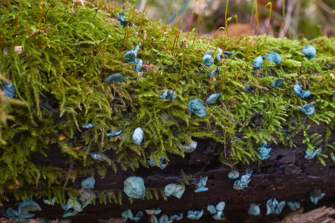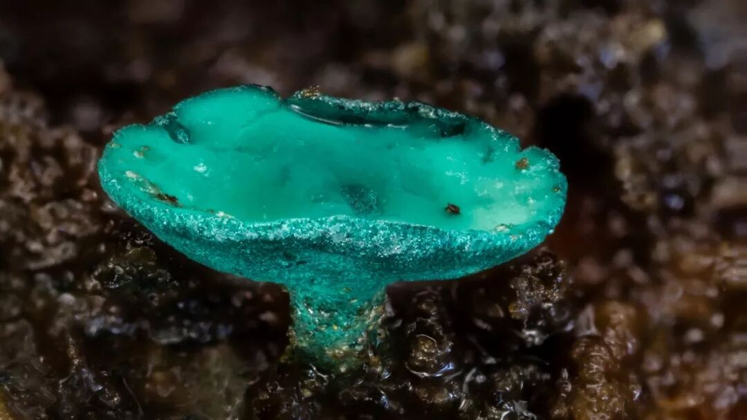 作为一种子囊菌门盘菌纲的真菌,小孢绿杯菌那杯盘形状的子实体又被称作子囊盘(Apothecia)。它通体呈现蓝绿色,想象一下小雨过后,子囊盘中积蓄起雨水,是否就如同斟满了绿色鸡尾酒的杯子呢?