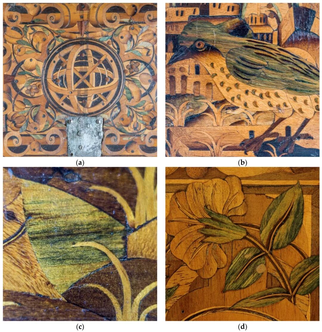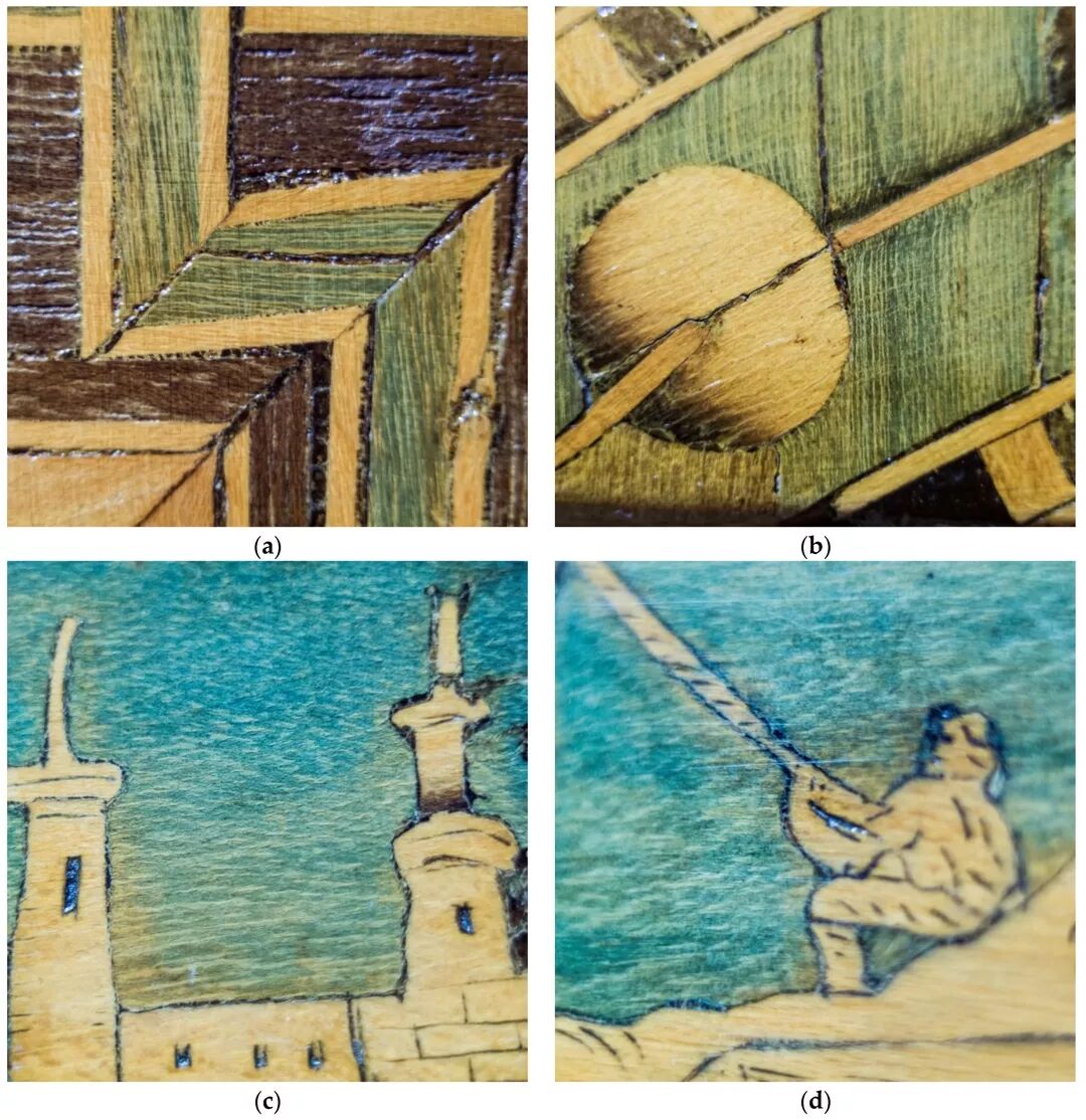 制作精美的细木镶嵌画需要不同颜色的木头,对于那个时代的工匠而言,符合要求的天然木材原料并非唾手可得。色调的深浅尚可通过选取恰当树种的木材得以实现,例如浅色系的桦木和深色系的胡桃木,但若要向细木镶嵌画中加入不同的颜色,该怎么办?