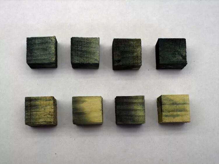 接种小孢绿杯菌菌丝后,被盘菌木素染色的木块。图片:Dana L. Richter