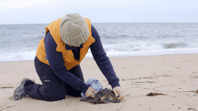 夏天是旅游旺季,科德角挤满了游客。而天气转冷,游人散去的时候,一只只海龟陆续被冲上沙滩。海龟冷到失去意识,看着奄奄一息。