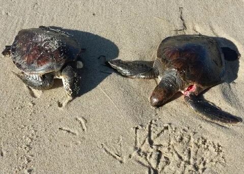 两只搁浅的绿海龟,右边那只被海鸥啄伤。图片:turtlejournal