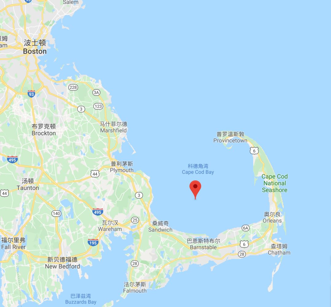 科德角像一个“钩子”,海湾很大,出口在北部。图片:Google Map