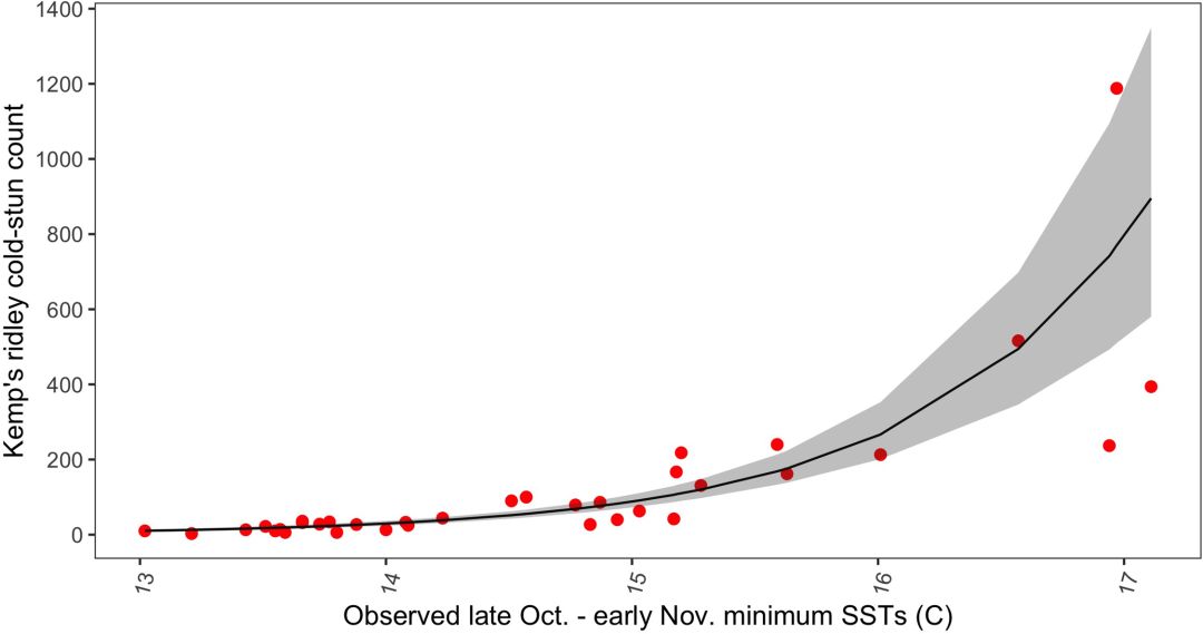 研究人员分析了往年数据发现,当科德角所在的缅因湾(Gulf of Maine)10月底到11月初之间的海面温度更高时,那年因为冷昏迷而搁浅的海龟数量就更多。