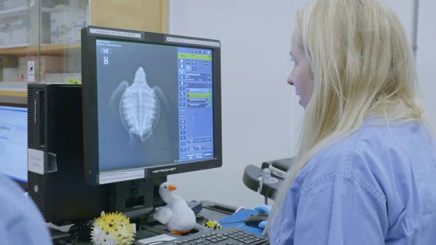 到了新英格兰水族馆的海龟医院,医生和志愿者会为海龟做各种检查:量体温、测体重身长、拍X光、抽血……这些工作不仅繁杂,还得小心翼翼的,尤其得注意温度。如果把冷昏迷的海龟突然放到一个温度较高的地方,海龟受到刺激可能直接就死了。工作人员都轻声细语的,也是怕刺激到衰弱的海龟。