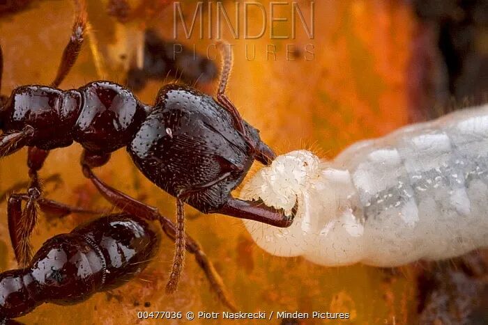 新几内亚,Amblyopone属的蚂蚁有“吸血鬼蚁”的俗称,因为它会吸取幼虫的血淋巴,血淋巴和脊椎动物的血液相似,但不用来传递氧气,所以少量损失是可以被接受的。图片:Piotr Naskrecki / Minden Pictures