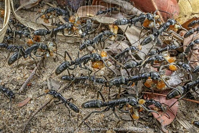 巨猛蚁属的一种蚂蚁(Megaponera analis)正在搬运捕获的白蚁。这种蚂蚁会舔舐受伤的同伴,帮助痊愈,而受伤太重的蚂蚁会主动“放弃治疗”,避免给同伴造成太大的损失。图片:Piotr Naskrecki / Minden Pictures