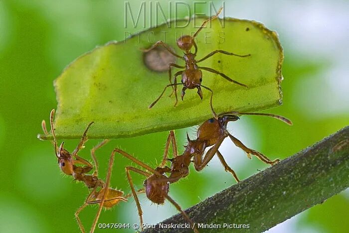 切叶蚁(Atta cephalotes)在运输树叶,这些树叶会被用来种植真菌。小个子的工蚁趴在树叶上,以防寄生昆虫的攻击。图片:Piotr Naskrecki / Minden Pictures