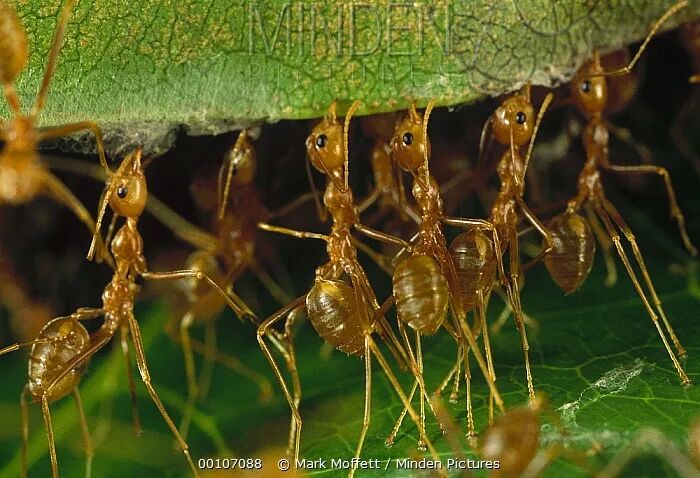 长结织叶蚁(Oecophylla longinoda)齐心协力,把叶片拉扯到一起,作为蚁巢的基础。图片:Mark Moffett / Minden Pictures