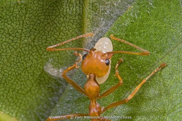 长结切叶蚁在“缝合”树叶,构成巢的墙壁。它使用的“线”来自幼虫吐的丝,即使是嗷嗷待哺的幼虫,也为大集体的工作尽一份力。图片:Piotr Naskrecki / Minden Pictures