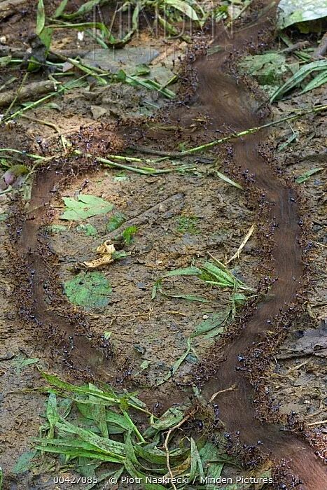 矛蚁属(Dorylus)蚂蚁行进的轨迹。巨大的兵蚁在道路两旁保护。图片:Piotr Naskrecki / Minden Pictures