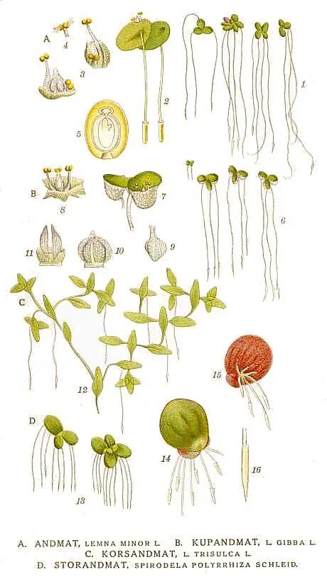 浮萍(A)、L. gibba(B)、品藻 L. trisulca (C)以及紫萍 Spirodela polyrhiza (D)的科学插画,可放大。图片:Carl Axel Magnus Lindman