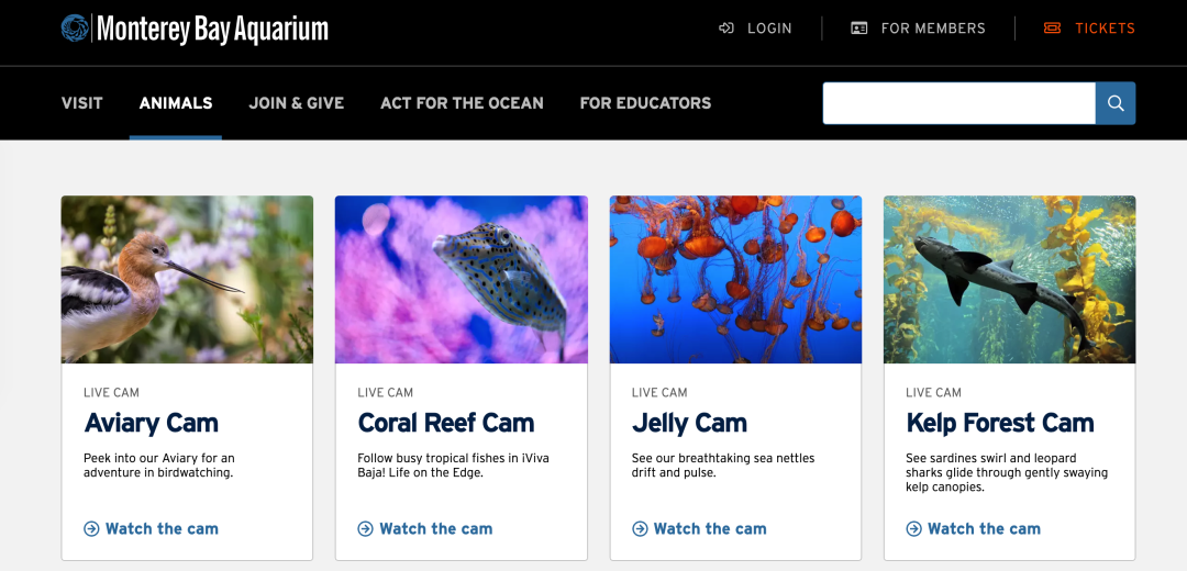 最近因为COVID-19疫情,蒙特雷湾水族馆也闭馆了,但是大家可以在水族馆官网上收看10个永久展区的直播和录播 ,其中包括水獭展区和巨藻森林。我个人最喜欢的是面朝蒙特雷湾的24小时直播,即便是当地的晚上,只看得到月光下面模模糊糊的剪影,但能听到海的声音也很治愈。