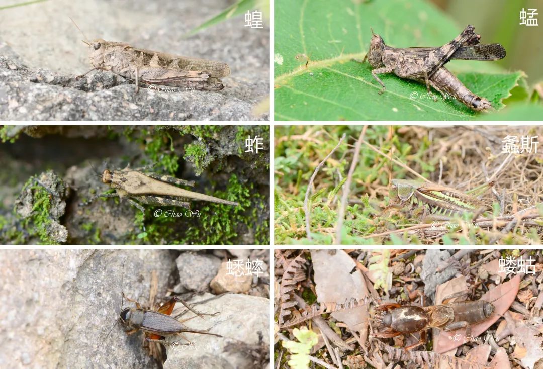 直翅目的几个主要类群。注意我们常说的蚱蜢、蝗虫,实际上分属三个不同的类群;蟋蟀和螽斯也并不是同义词。