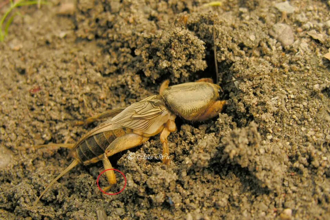 单刺蝼蛄,体型显著大于东方蝼蛄,并且后足胫节距不超过2枚(红圈区域),而东方蝼蛄有距4~5枚。摄于北京房山。