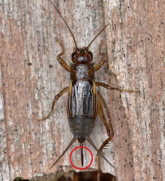 红圈为雌性蟋蟀的针状产卵瓣。图片:Ryan Hodnett / flickr