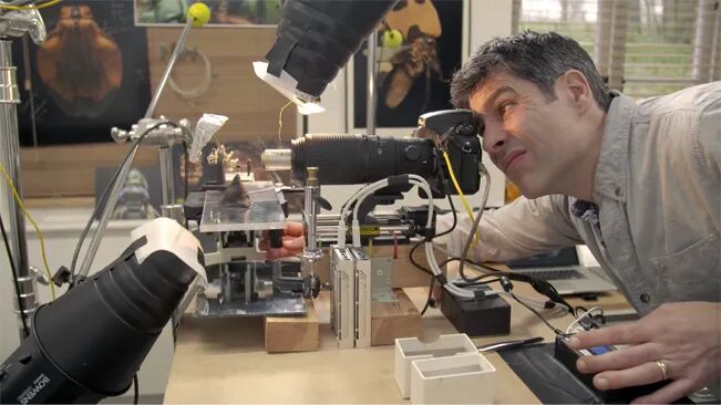 要先把昆虫标本分为30个区域,用显微镜头分别拍摄。每只标本会产生8000多张照片,3周时间才能完成一张写真。