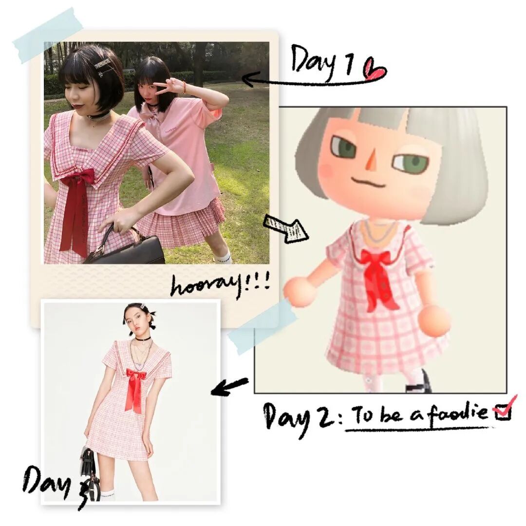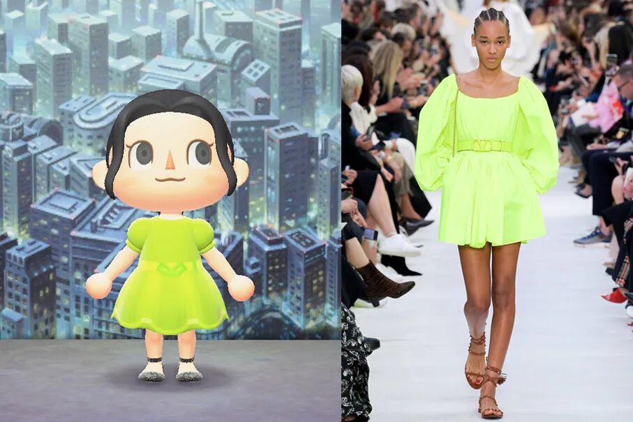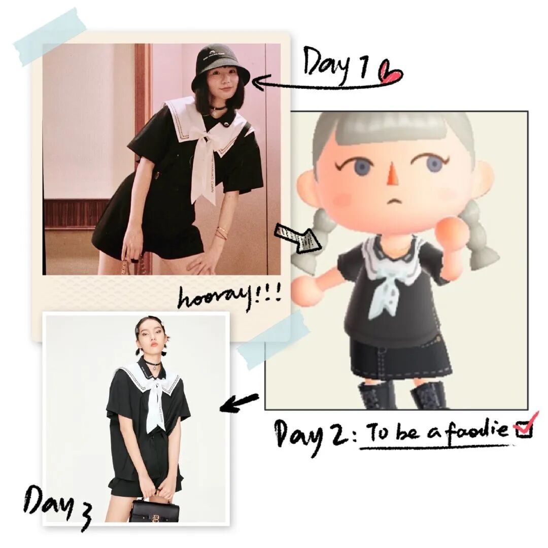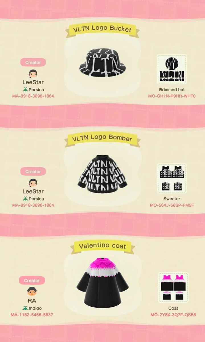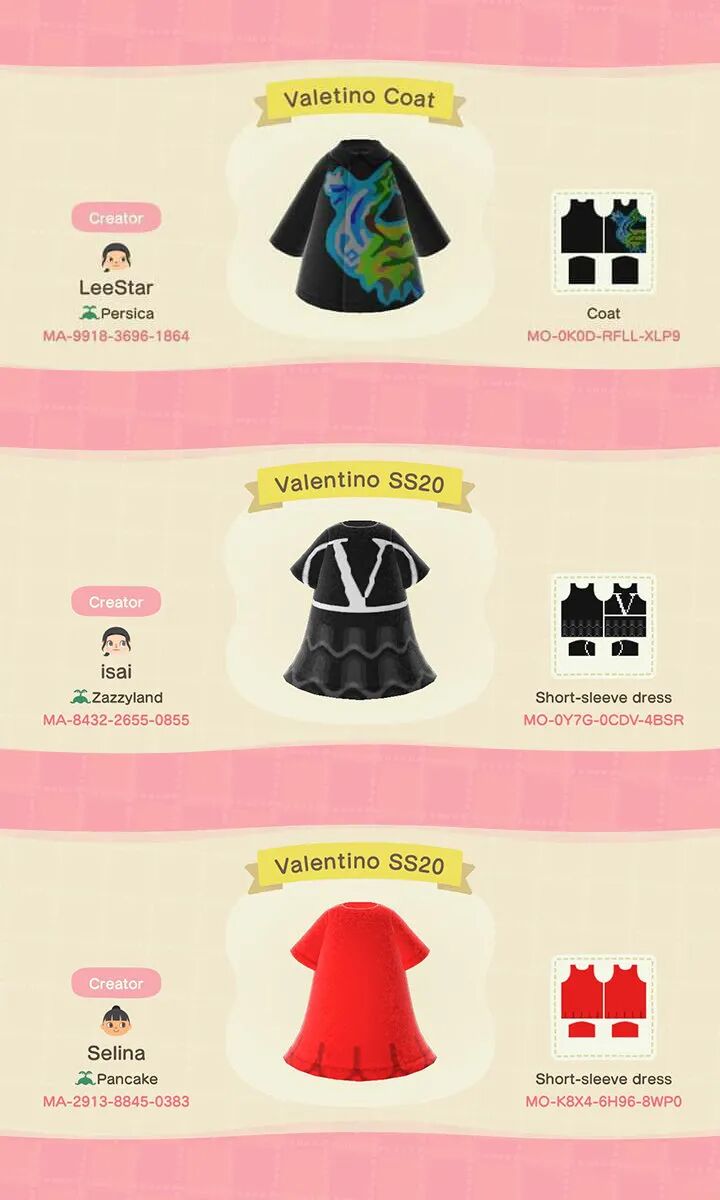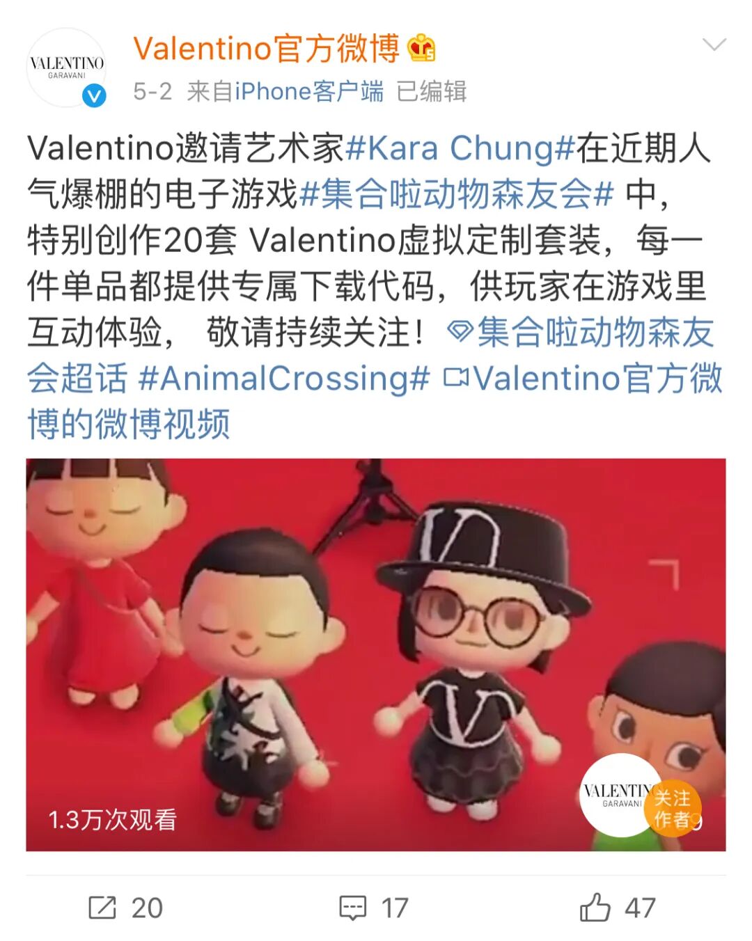 以上两款单品均来自Peacebird与樱桃小丸子联名款,出现在这样一个温情治愈的游戏当中,是可可爱爱本人没错了。除了国内品牌,越来越多的一线奢侈品品牌也通过各种方式加入到《动物森友会》当中。5月2日,Valentino通过官方微博宣布,邀请艺术家、@animalcrossfashionarchive 账号主理人Kara Chung在《动物森友会》中特别创作了20套品牌虚拟定制套装,且每件单品都提供了专属下载代码,供游戏玩家互动体验。