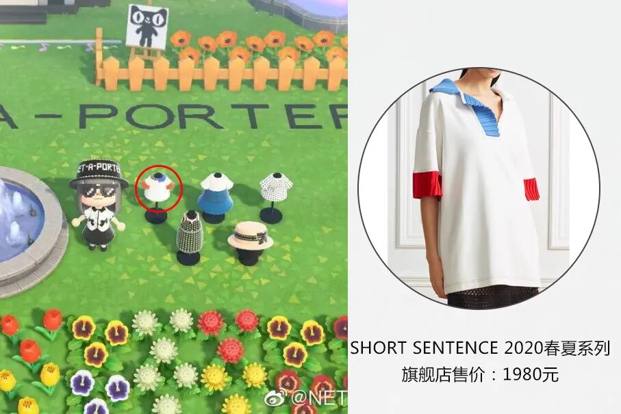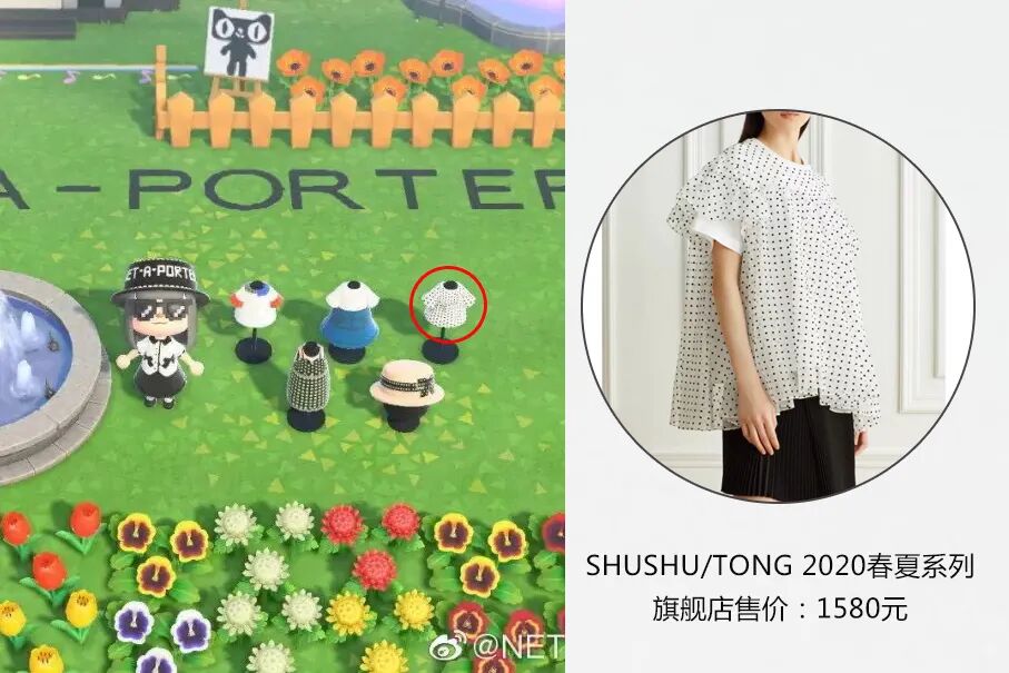 这款人人可以做“赛博李子柒”的游戏,由任天堂在3月20日推出上线,填充了疫情期间人们大量的宅家时光。就算你没有Switch,森友硬通货“大头菜”、必备休闲技能钓“鲈鱼”在你朋友圈也一定没少刷屏。最重要的是游戏中的DIY元素,允许人们通过一小块元素或者Logo设计出自己想要的单品(家具、衣服、配饰等),为疫情期间遭受重创的时尚行业带来新的营销机会点。4月初,英国奢侈品电商Net-a-Porter率先“登岛”,陪着Net-a-Porter一起登岛的还有一众中国设计师品牌。诸如SHUSHU/TONG、Staffonly、Marchen、Short Sentence、Calven Luo的春夏系列单品,让大家过足“虚拟购物”的瘾。同时这些单品的实物,也在Net-a-Porter天猫旗舰店同步发售,实现了虚拟与现实的高度互通。《动物森友会》中部分Net-a-Porter中国设计师同款