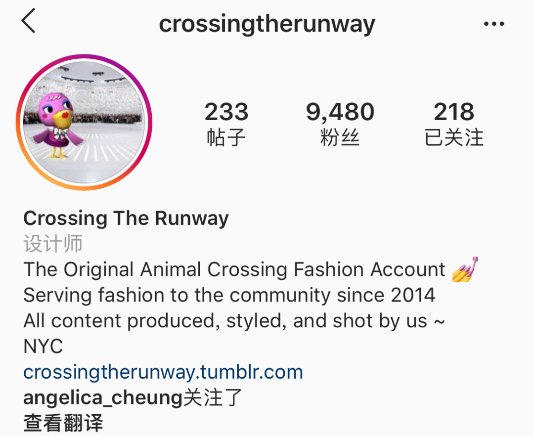 @crossingtherunway 账号创建及运营的时间则要更久一些。主理人Shel Orock、Richmond Young都是设计师出身,前者是网页设计师,后者是工业设计师,从2014年就开始将各种时装品牌的单品“穿”到游戏主角身上。@crossingtherunway 稍早期的账号内容