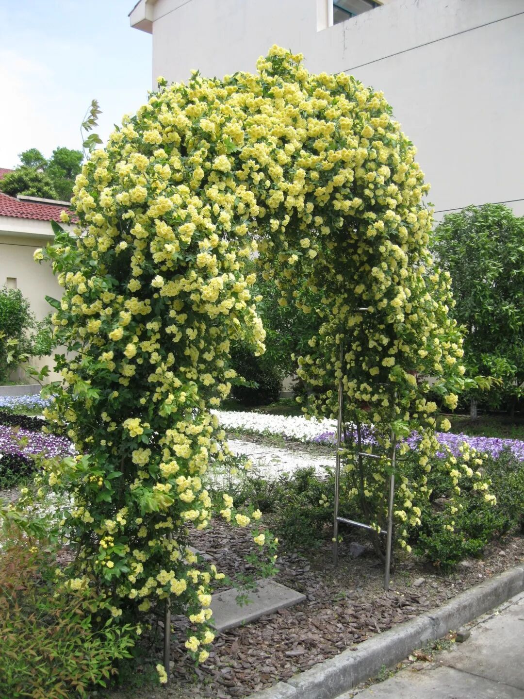 木香花的枝条细长、叶片繁密,生长迅速又擅长攀爬,往往要借助篱垣、花架、墙壁攀援而生。一旦当它爬满棚架,就有无数的翠叶绿枝垂挂而下,仿佛巨大的绿色帷幔一般。作为一种漂亮的庭园棚架植物,木香花不仅兼具观花、遮阳的效果,还非常适合园林造景和绿化。