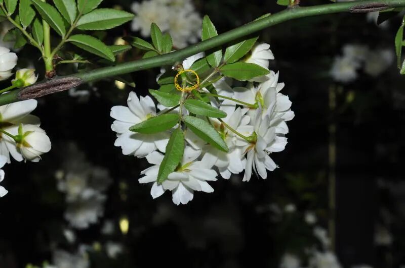 木香花的原变种白色重瓣,气味芳香。数朵花聚集成簇,托叶(图中橙色圈的部分)线状披针形。图片:老勿大