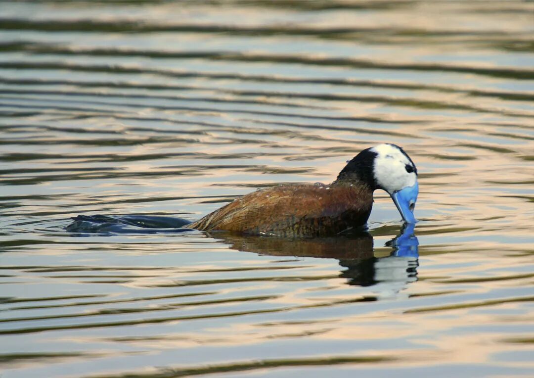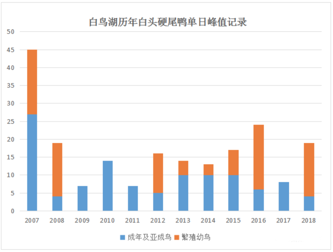 每年4月底,白头硬尾鸭会来到这里繁殖,10月中旬再迁徙回地中海或北非。自2007年被发现开始至2019年,每年都有少则4只、多则20余只的白头硬尾鸭来到白湖繁殖。