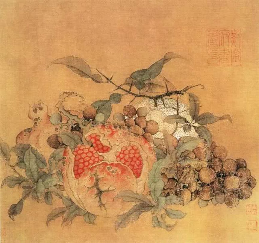 除了诗词歌赋之外,也有一些关于石榴的画作流传了下来,比如南宋时期的《橘子葡萄石榴图》(南宋·鲁宗贵)中,我们就得以一窥宋时石榴果的风采: