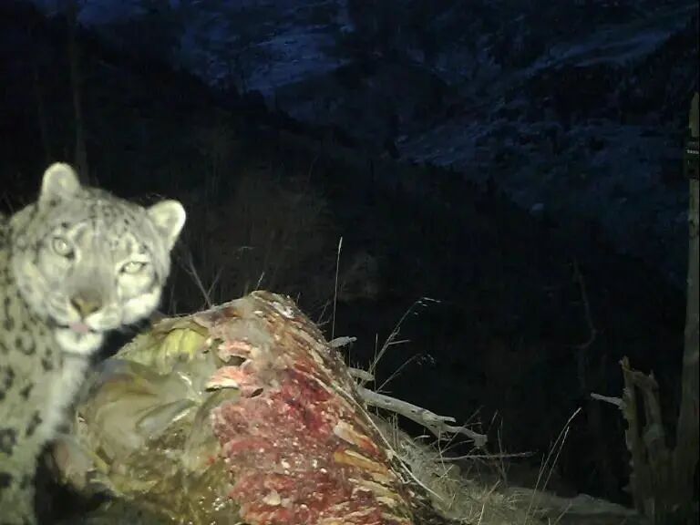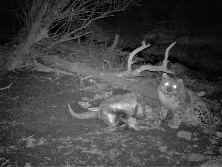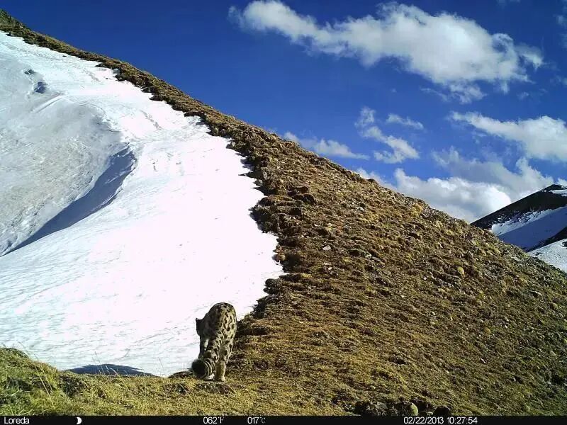 我们在雪豹可能经常经过的地方布设了红外线触发式相机。只要相机前有动物经过(或任何风吹草动),相机就会启动、拍摄。每隔几个月,我们要去给红外相机换电池和储存卡,同时收获几十到上万张照片。