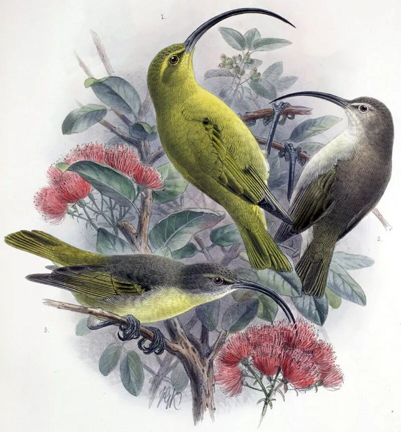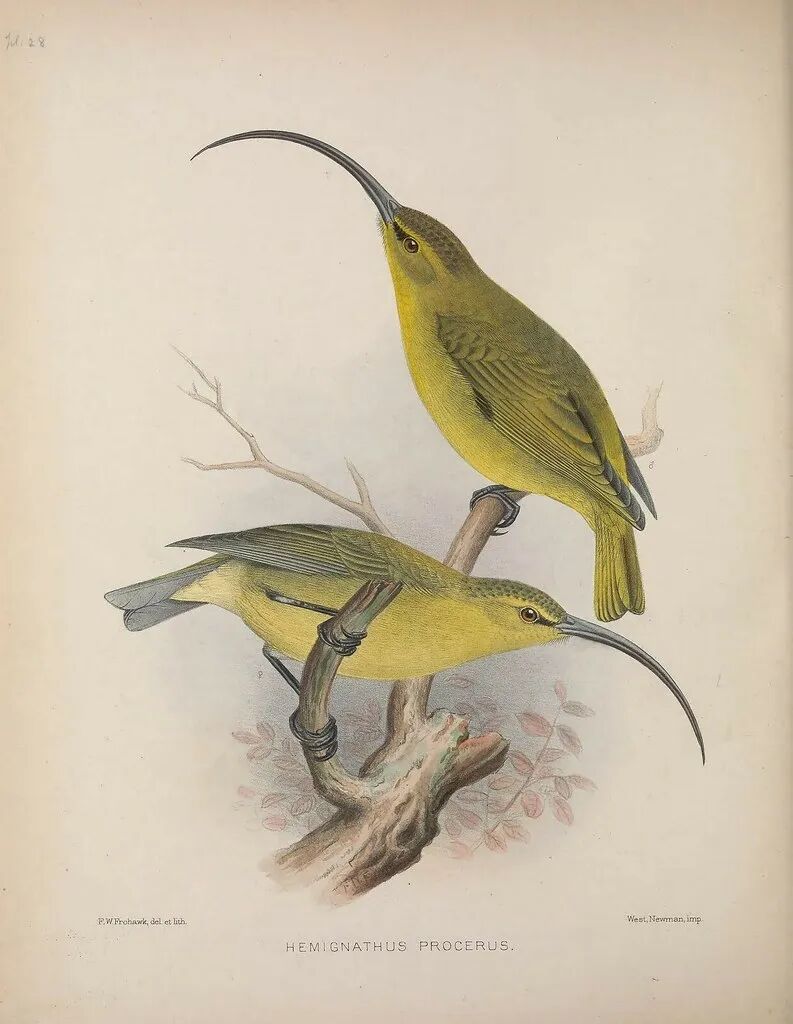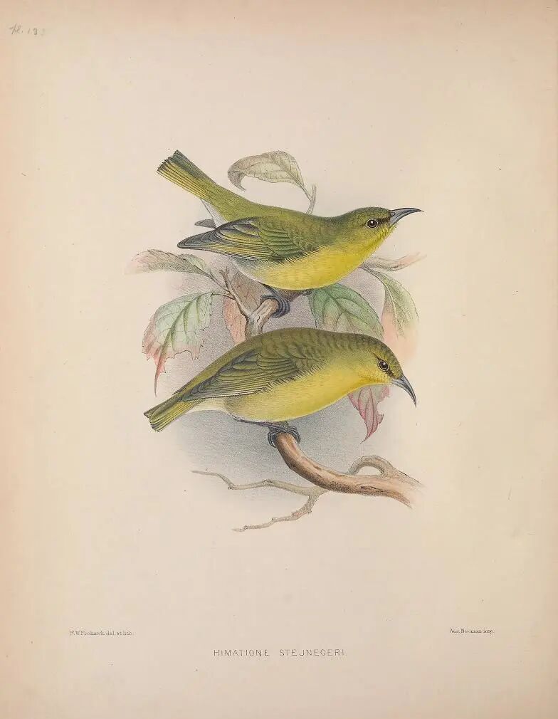长嘴管鸹(Akialoa obscura),于约1940年灭绝。夏威夷是生物多样性最复杂和受人类威胁最严重的地区之一,许多本地特有的鸟种已经灭绝。图片:Biodiversity Heritage Library / Flickr