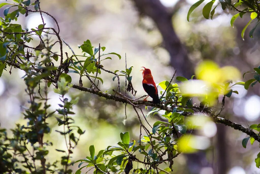 曾经广布于夏威夷群岛的镰嘴管舌雀(Vestiaria coccinea),现在它在考艾岛的种群,正处于下降趋势。图片:Melissa McMasters / Flickr