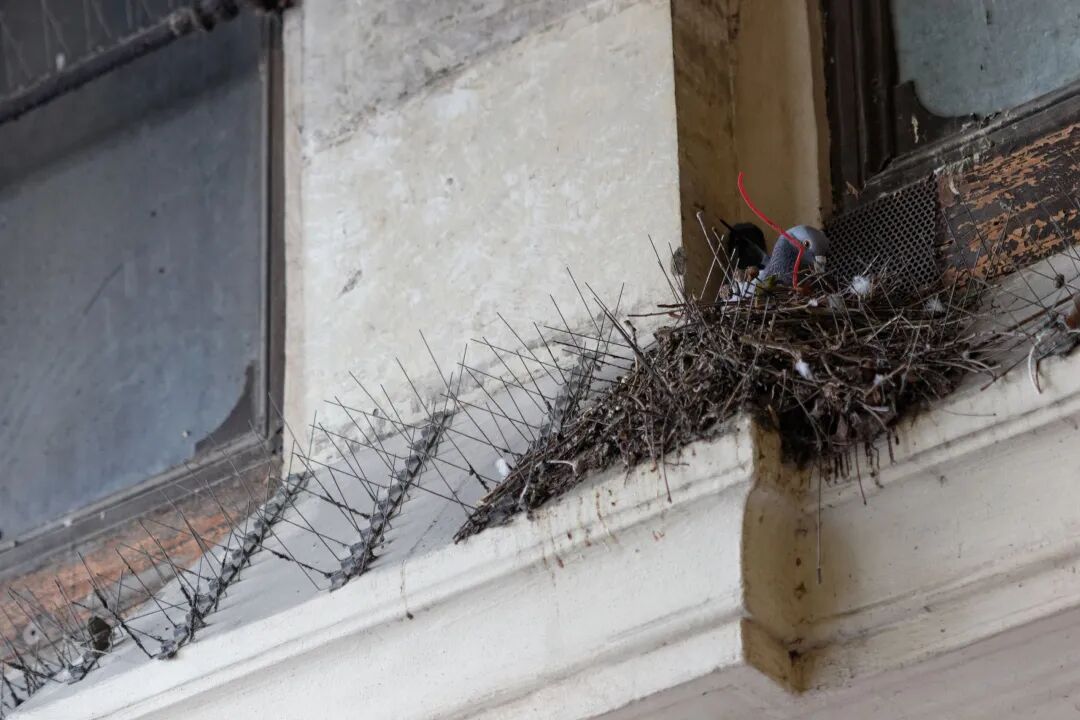 建筑物上加装的防鸟针。不过有时这些针反而会为鸟儿搭建巢穴提供便利,而且在很多国家,移除鸟巢是不被允许或者受到严格限制的。图片:Coyau / Wikimedia Commons