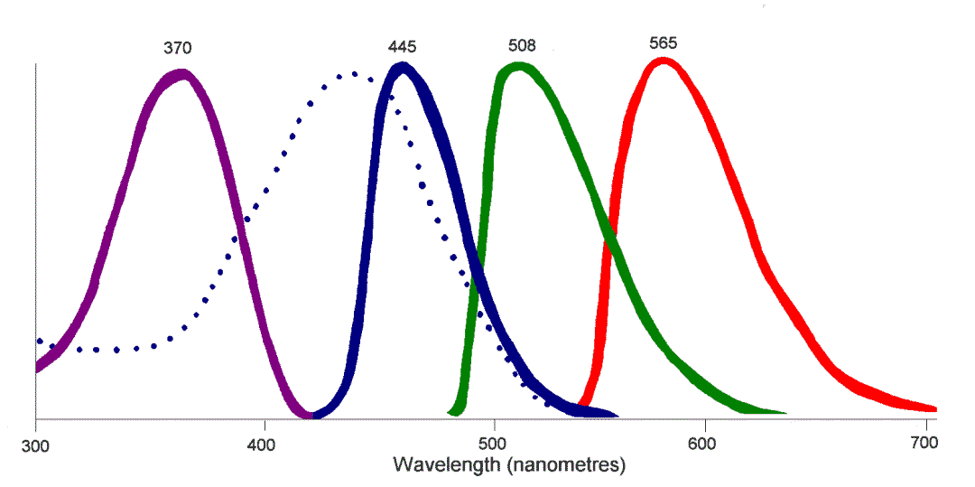鸟类眼中四种视锥细胞对应的光谱波段。图片:Jimfbleak / Wikimedia