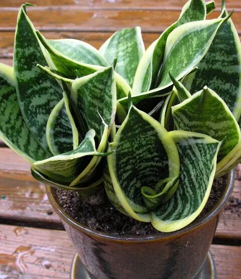 虎尾兰的变种,是很常见的观赏栽培虎尾兰。金边虎尾兰叶扁平,先端渐尖,挺直生长,如同一把直立的宝剑;叶片浅绿色,上面分布着深绿的横纹,边缘有浅黄色至金色的镶边。