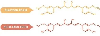 姜黄素随pH而改变的结构。pH<7.4时是上面的二酮式结构(黄色),pH>8.6时转变为下面的酮-烯醇式结构(红色)。图片:Compound Interest