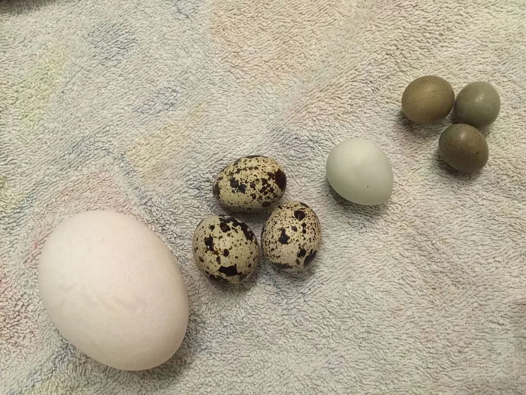 从左到右依次为:鸡蛋、鹌鹑蛋(花色和白色)、蓝胸鹑蛋。图片:メルビル / Wikimedia